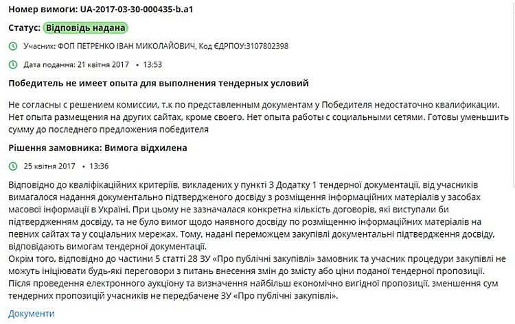 На отсутствие опыта у победителя торгов указывал и его конкурент, но, по мнению Николаевской ОГА, опыта в размещении материалов на собственном сайте достаточно для получения подобного заказа.