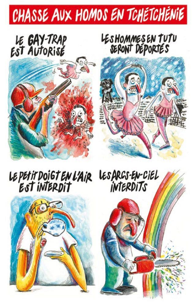 Художники сатирического издания опубликовали материал и серию рисунков в рамках темы о преследовании геев в Чеченской республике, власти которой журналисты обвинили в серии пыток и убийств представителей ЛГБТ-сообщества.