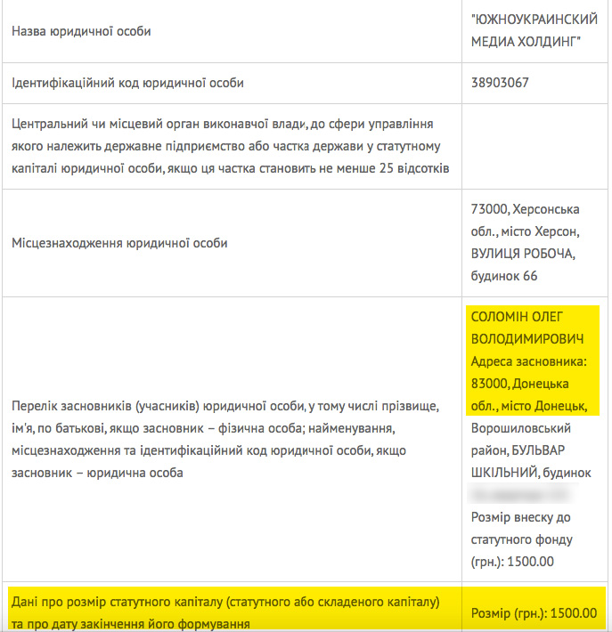 ООО "Южноукраинский медиа холдинг" зарегистрировано в Херсоне, его директором является хорошо известный в этом городе общественный деятель и главный редактор интернет-ресурса "Херсонские вести" Игорь Трубаев. Учредитель фирмы — Олег Соломин, проживающий, по данным ЕДР, в г.Донецке.