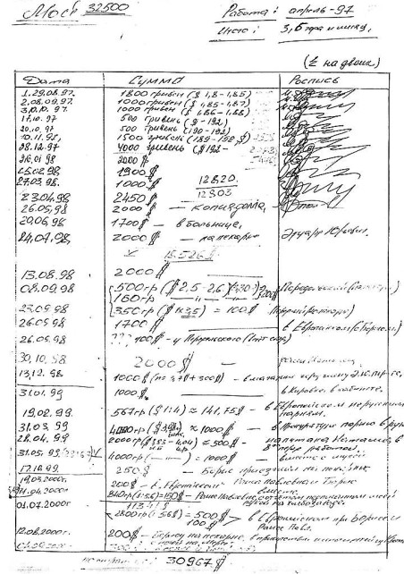 Впоследствии Марченко перебрался в прокуратуру Кировского района Донецка, но регулярно наведывался в Марьинку, забирая свою долю прибыли от деятельности пекарни. А когда, случалось, государственные дела требовали присутствия господина прокурора в областном центре, Ополев сам приезжал в Кировскую райпрокуратуру Донецка и привозил компаньону деньги. Эти деньги Марченко каждый раз записывал в ведомость, куда записывал дату, сумму, курс доллара и ставил собственноручную подпись. Вот эта прокурорская «декларация о доходах»: