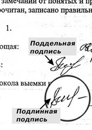 Кроме того, Линник и Степаненко изготовили еще несколько роцессуальных документов — в частности, протоколы выемки. Вот фрагмент одного такого протокола с фальшивой подписью следователя Вишневской. Для сравнения здесь же помещено изображение подлинной подписи.