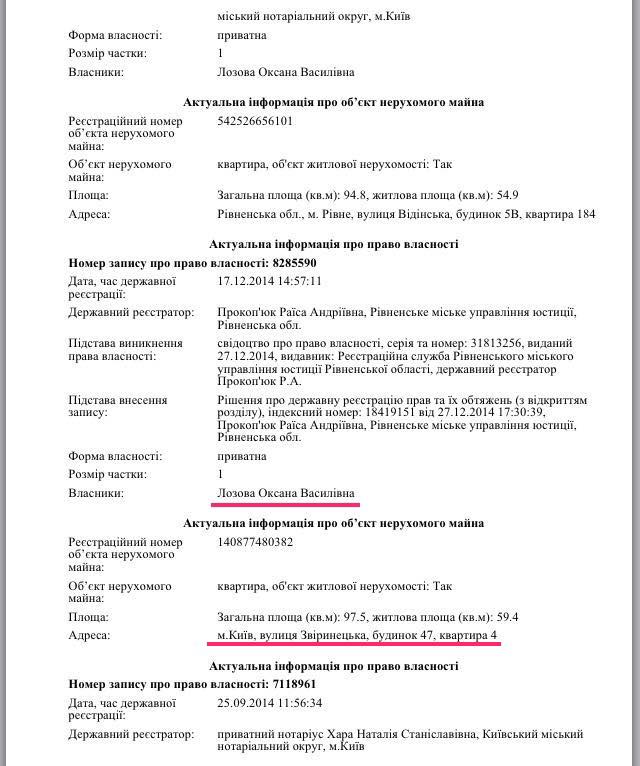 Так, по его словам, 25 сентября 2014 года, за месяц до того, как ее сын стал депутатом, Оксана Лозовая приобрела в Киеве на Печерске квартиру, расположенную по адресу: ул. Зверинецкая, 47, кв. 4.