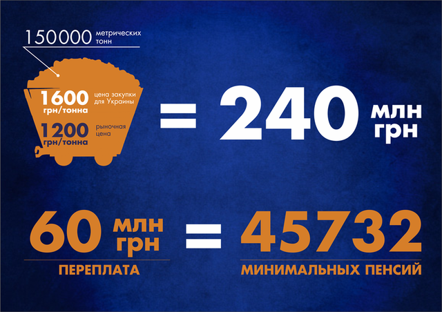 Но обидно и то, что Украина за свой же родной уголь вынуждена была по контракту платить намного дороже рыночной цены. За якобы «российский» уголь ГПВД «Укринтерэнерго» платило ООО «Русснефтедобыча» более 1600 грн за тонну (около 60,5 долларов). В то время, как рыночная стоимость угля составляла примерно 1200 грн за тонну. Таким образом, наша страна, закупив 150 000 метрических тонн Донецкого антрацита по ценам Игоря Сало, переплатила 60 млн грн. За эти деньги государство могло бы месяц содержать 45 тысяч 732 пенсионера.