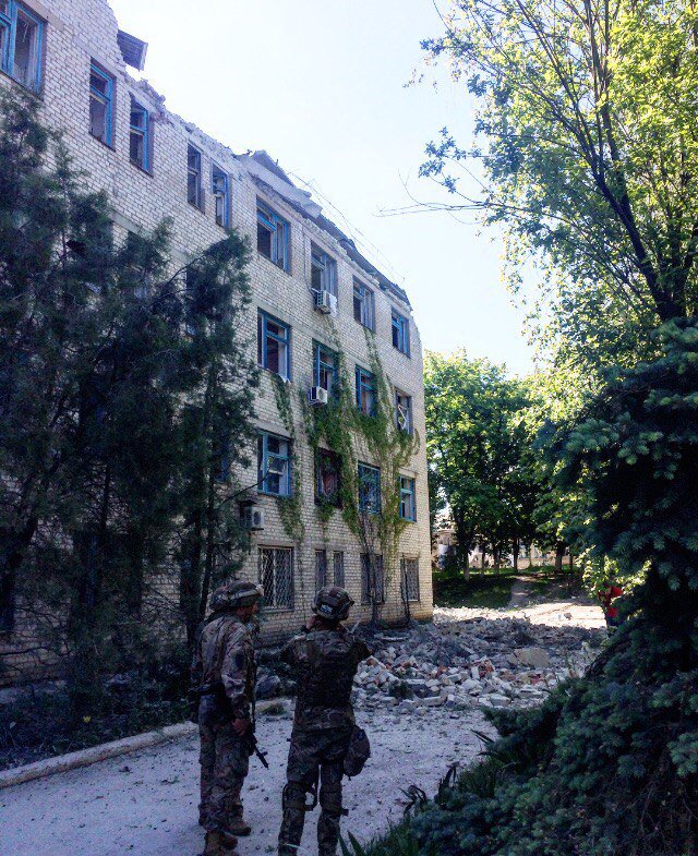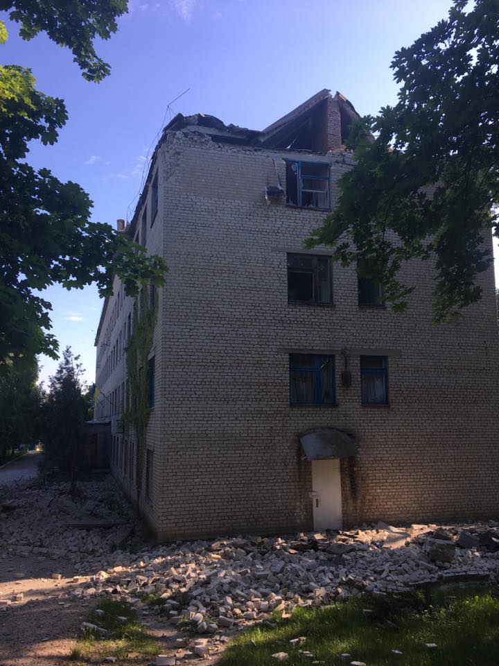 А это больница. Последний этаж разрушен, все вокруг усыпано обломками. Получите привет от «братского народа».