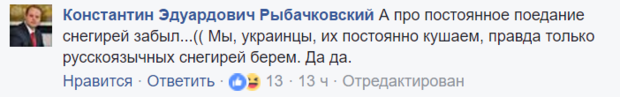 "А про постійне поїдання снігурів забув... Ми, українці, їх постійно їмо, правда, тільки російськомовних снігурів беремо. Так-так", - сміються у мережі.