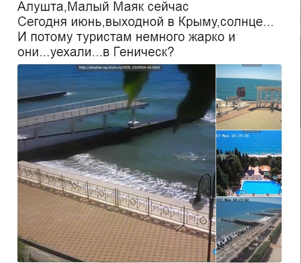 5. Коктебель. Крымнашист Горный с восторгом постит фото военной техники оккупантов и с сожалением — фото пустых пляжей. Связи между фотографиями не видит.