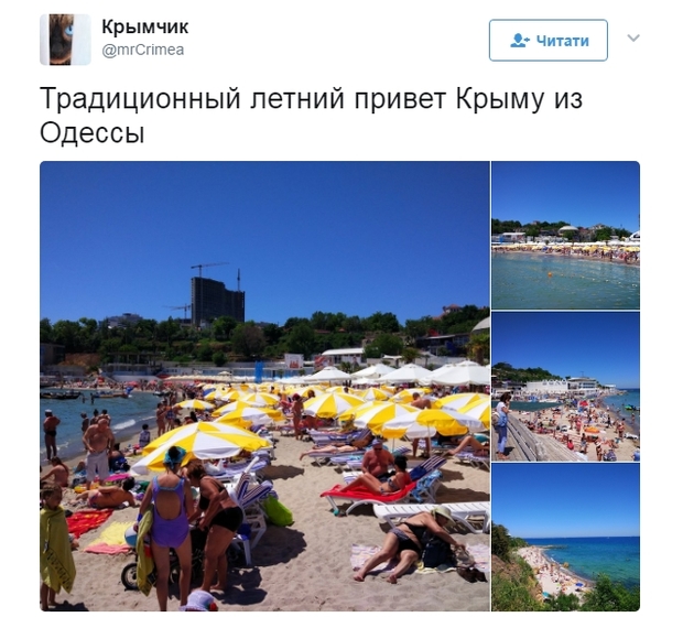 4. Стекловатник Сандрик из Судака отчаянно умоляет россиян ехать в Крым. Говорит, что у нас круто и безопасно, потому что каждый пятый — чекист: "Кстати, тут любимые москвичи и прочие материковые жалуются про заморозки июньские и холода в больших городах центральной россии. А мы че вам и зачем Крымнаш на родину возвращали — в самую родную гавань и буквально? Вам тут медом не намазано вообще? Посмотрите — море есть, пляж, жарко, чуть людей пока и просторно. Че вам ещё надо, балованные? Не, ну, давайте за рубеж и очковать террористов и всяких. Или в Крым. Ну, у нас же каждый пятый, если не четкий сотрудник товарища майора, то стопудово его кум, сват или сосед по даче".