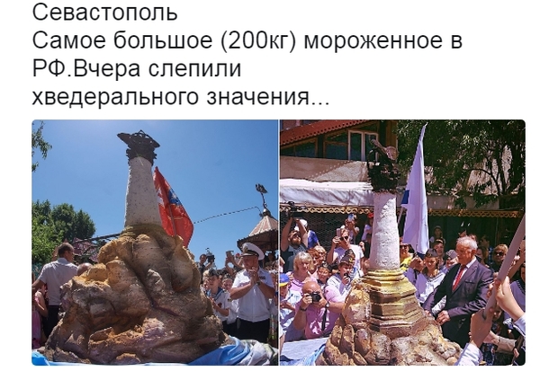 16. В Севастополе вчера слепили самое большое мороженное хведерального значения — 200 кг. Но почему-то оно очень сильно напоминает якутский шедевр из говна. Кстати, из мороженного вылепили памятник затопленным кораблям. Скрепно.