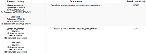Владислав Иоанно задекларировал 106496 гривен за 2016 год, а его жена получила 22464 гривен социальных выплат по уходу за ребенком.