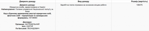 Сергей Загребельный задекларировал 106475 гривен за 2016 год.
