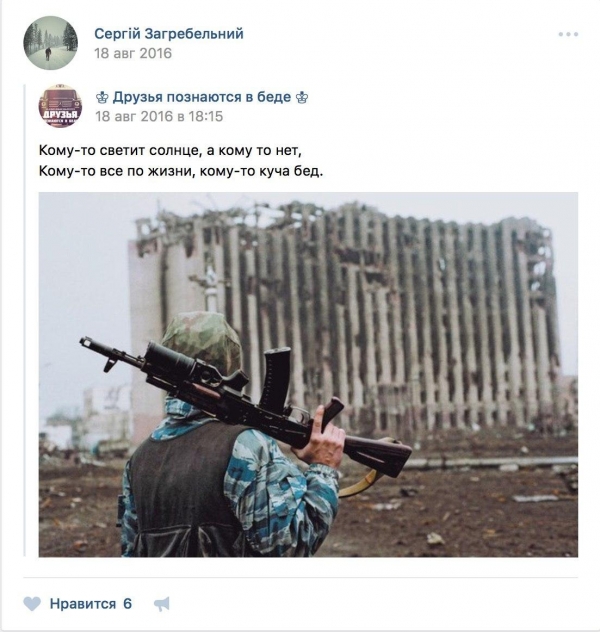 Также на странице Загребельного есть репосты из группы в соцсети "ВКонтакте", занимающейся рекламой и пропагандой воинских подразделений Министерства обороны Российской Федерации.