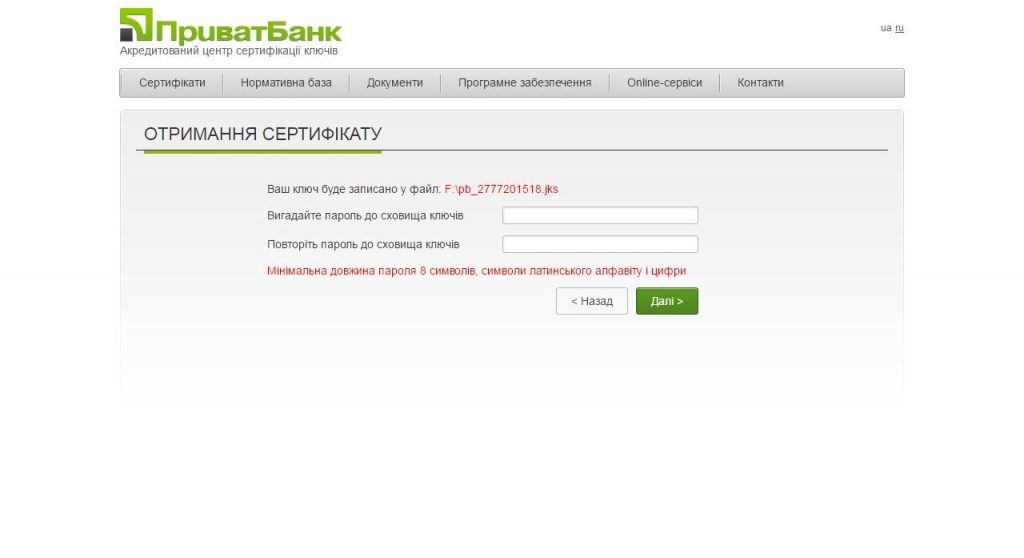 Тут ви повинні придумати пароль до свого електронного ключа, та ввести його 2 рази, пароль обов’язково запишіть або запам’ятайте, він вам ще знадобиться. Натискаємо «Далі»