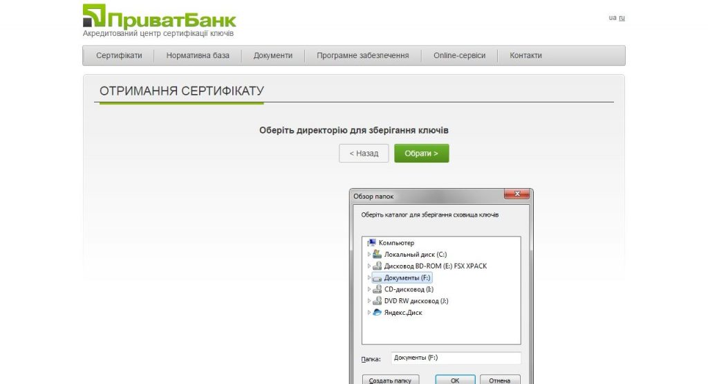Далі вам потрібно обрати місце розташування файлу електронного ключа, краще його зберігати на з’ємному носії — на флешці або з’ємному диску, але можна і на жорсткому диску вашого ПК