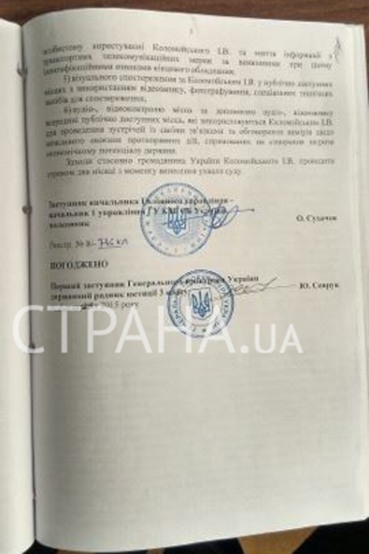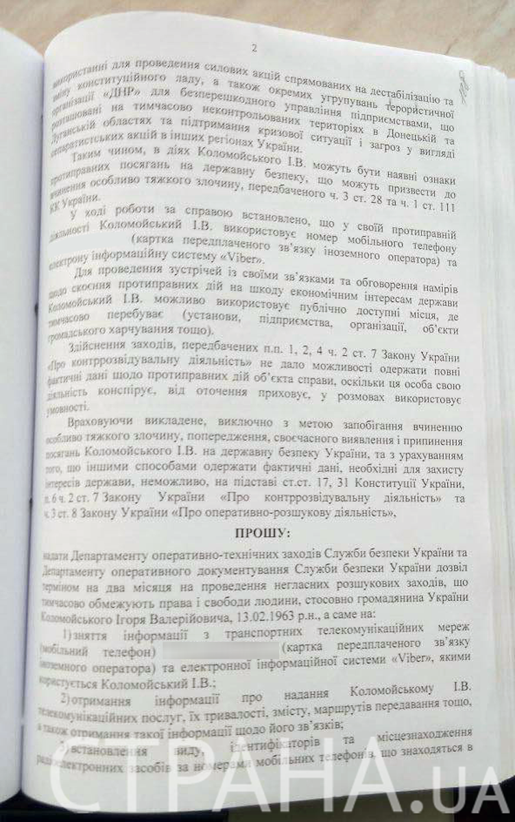 Так, в ходатайстве указано, что «в ходе осуществления контрразведовательных операций получена информация, которая подлежит проверке». А именно, что Коломойский якобы осуществляет подрывную работу против Украины, связанную с дестабилизацией кредитно-финансовой системы государства, с выводом средств в теневое обращение с целью дальнейшего финансирования собственных военизированных формирований, а также пророссийской террористической организации «ДНР». С целью проверки этой информации СБУ и просила у суда разрешения на прослушку телефонов Коломойского и негласное наружное наблюдение за ним.