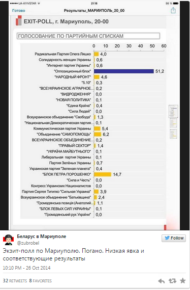 "По Донецкой области итоговая явка около 30%, побеждает Оппозиционный блок, ну, и по всем одномандатным округам бывшие "регионалы", кроме Таруты", - написал он.