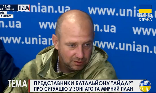 «Наб’ю морду за те, щоб не збирав там всяких і не говорив, що вони комбати «Айдара». Мій номер телефону знає, а на прес-конференцію поліз з якимось самозванцем і написав звернення. Я це звернення, в принципі, підтримую, але нічого йому з якимось ... виступати! Ось за це він у мене і отримає», - засудив дії Семенченко «айдаровець».