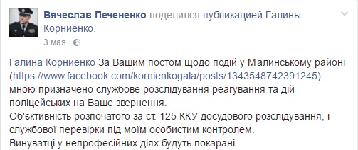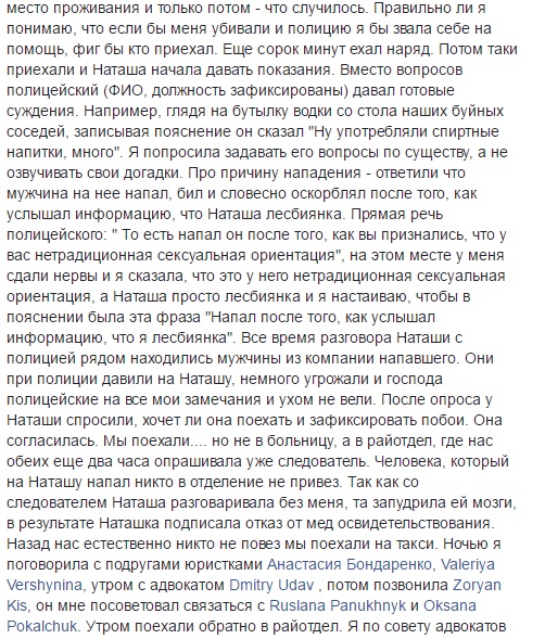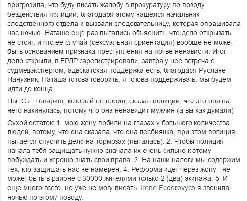 Согласно официальному заявлению Нацполиции, инцидент являл собой конфликт между мужчиной и женщиной, о гендерных причинах которого — ни слова. Руководитель областного Главка Нацполиции Вячеслав Печененко при этом пообещал назначить в отношении полицейских, которые прибыли на вызов лесбиянок, служебную проверку.