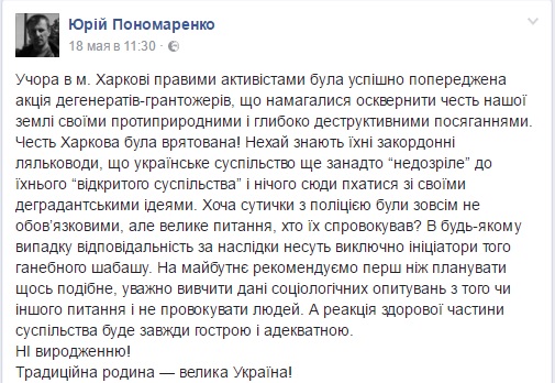 Несмотря на его фактическое признание, Пономаренко не был привлечен к ответственности. Спустя несколько дней после инцидента на «Марше Равенства» он в компании «побратимов» и членов «Национального корпуса» был замечен среди участников блокирования отделения «Сбербанка» в Харькове.