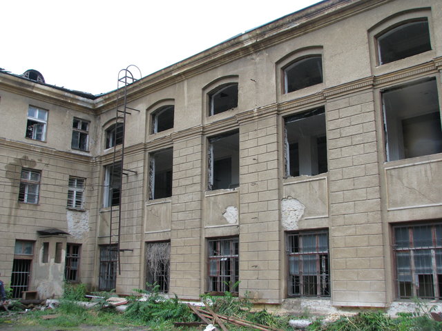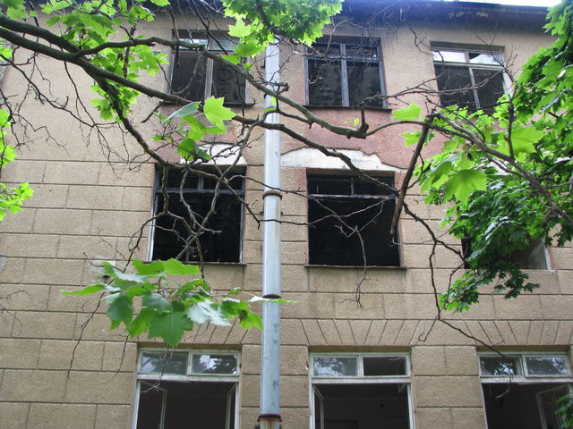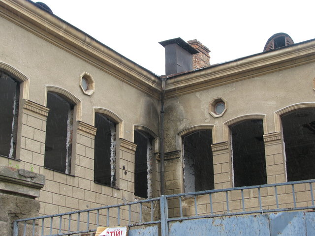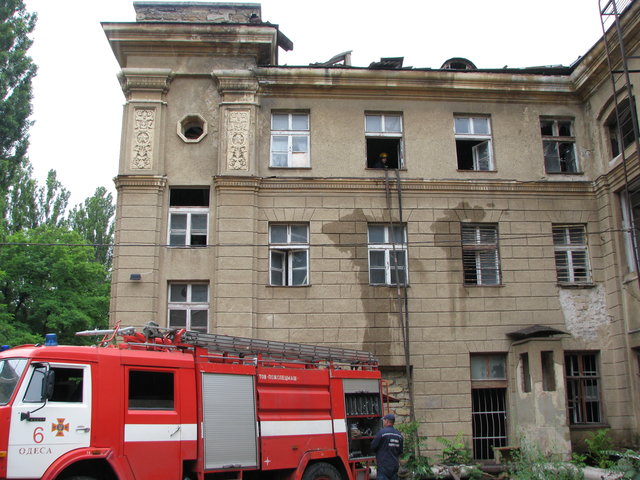 Большая часть здания, где произошло возгорание заброшена. Местами видны черные оконные рамы и почерневшие от гари еще предыдущих пожаров стены. В сотне метров от места ЧП находится Одесский окружной административный суд, а напротив него учатся и живут будущие военные.