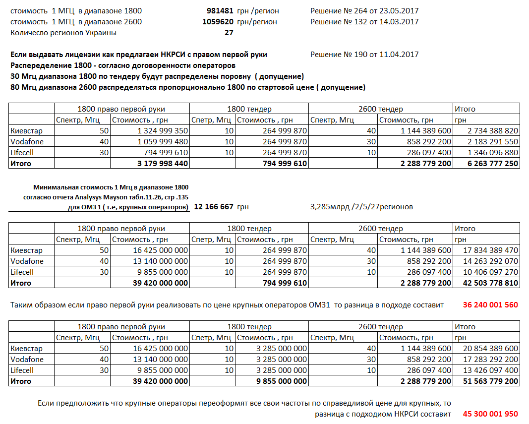 Но по всей видимости НКРСИ, решил, что для участников тендера такой расчет «не подходит» и сделал свою калькуляцию, тоже сославшись на этот самый отчёт, только применили суммы, предложенные для малых операторов.