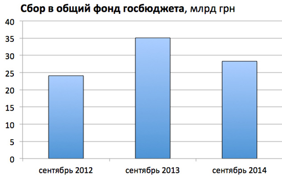 В сентябре 2014 года сбор без учета возмещения НДС составил 28,3 млрд грн или 90,1% от плана. Недобор - 3,1 млрд грн или около 10%. Однако цифра провала оказывается еще выше в сравнении с сентябрем 2013 года: сбор без учета возмещения НДС упал на 6,8 млрд грн или почти на 20%.