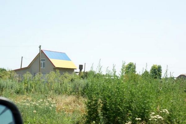 Но не все так плохо по этой трассе! Полюбуйтесь на крышу на фото! Правда, класс! Вокруг только сорняки и бурьяны. Хороший символ Украины получился: флаг красивый, мы гордимся, а вокруг запустение, бедность и жуткая безысходность.
