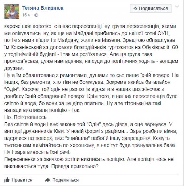 Правозащитница Татьяна Близнюк рассказала, что в общежитии проживают переселенцы из Донбасса, ранее принимавшие активное участие в Революции Достоинства.
