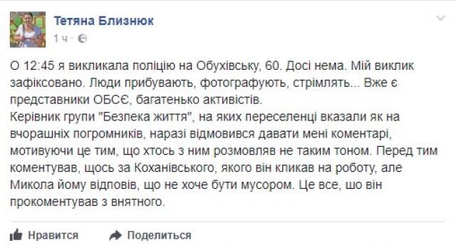 Теги: ПолицияАктивистыБлизнюк ТатьянаКива ИльяЛебедь МихаилБезопасность жизниПогромПереселенцыКиев
