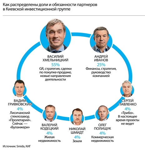 Чтобы структурировать и контролировать этот ворох активов, в 2003 году партнеры создали управляющую компанию Kyiv Investment Group. Среди ее основателей были не только Хмельницкий (чуть больше 50%) и Иванов (около 25%), но и группа младших партнеров.