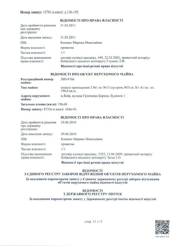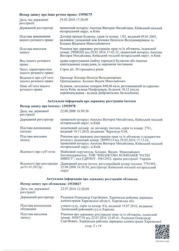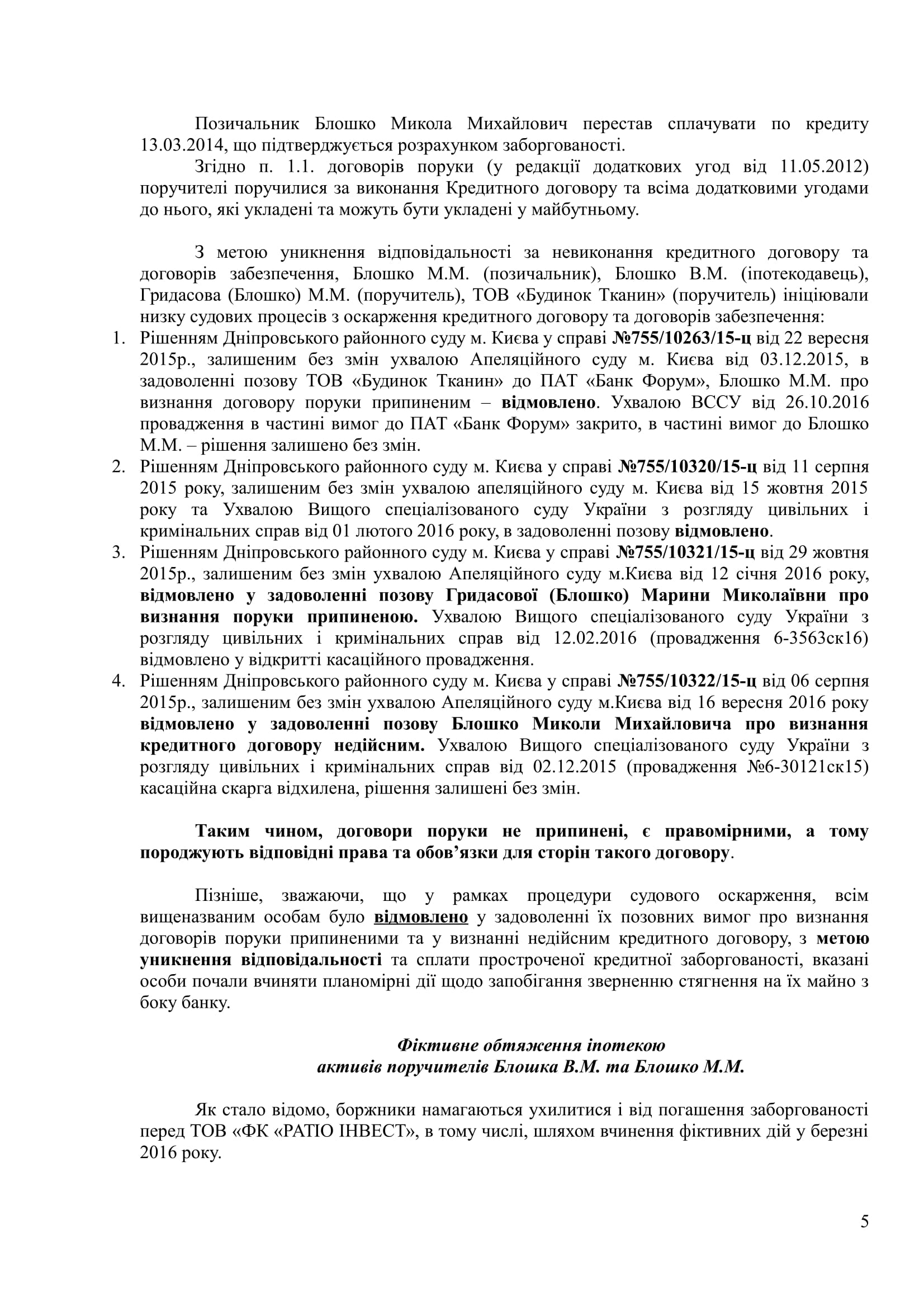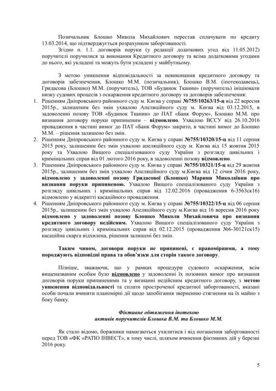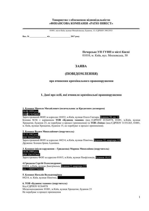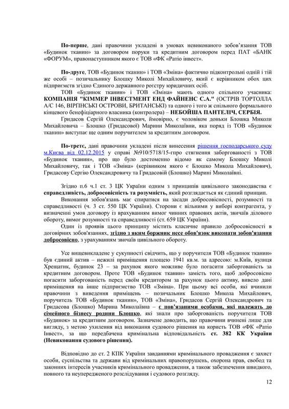 Но чтобы избежать исполнения этого решения суда, семья Блошко применила еще одну хитромудрую схему. Еще на этапе судебных дрязг, в марте 2016 года, помещения ООО «Будинок тканин» были переданы в уставной фонд ООО «Змина», которое также подконтрольно семье Блошко. После этого ООО «Змина» продало 2/3 здания Сергею Гридасову – зятю Николая Блошко, мужу Марины, а еще 1/3 – самому Николаю Михайловичу. А в августе 2016 года Сергей и Николай снова внесли помещения в уставной фонд ООО «Змина», но уже от своего имени. Очевидно, что цель этих фиктивных операций – сделать невозможным выполнение обязательств по кредитному договору, на данный момент перед ООО «ФК «Ратио Инвест», что подпадает по действие статей Уголовного кодекса об умышленном неисполнении судебных решений.