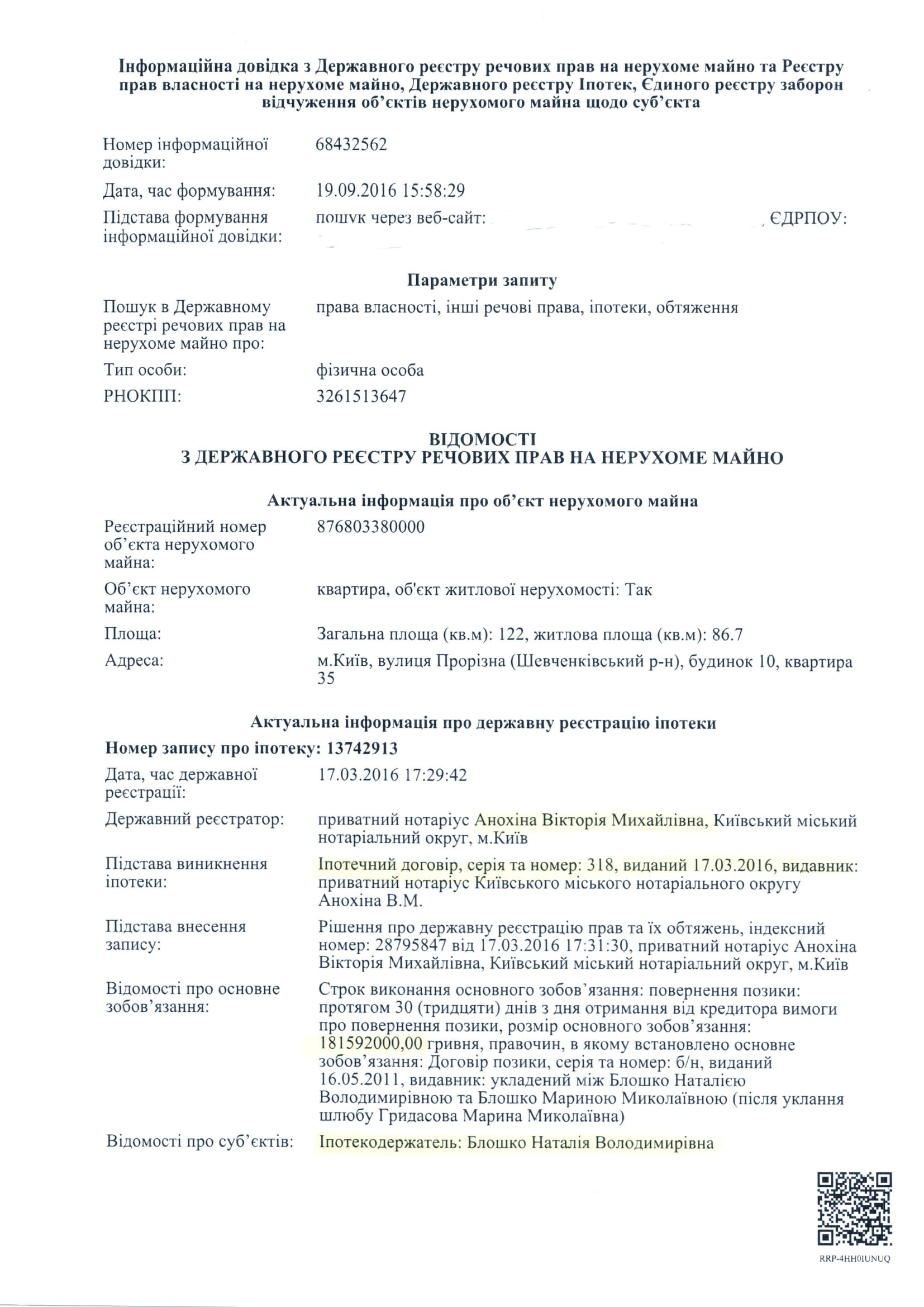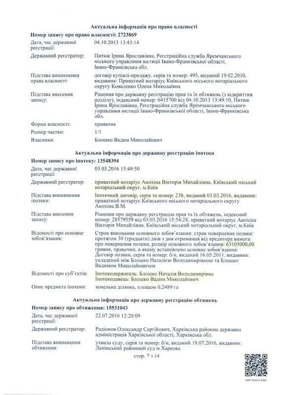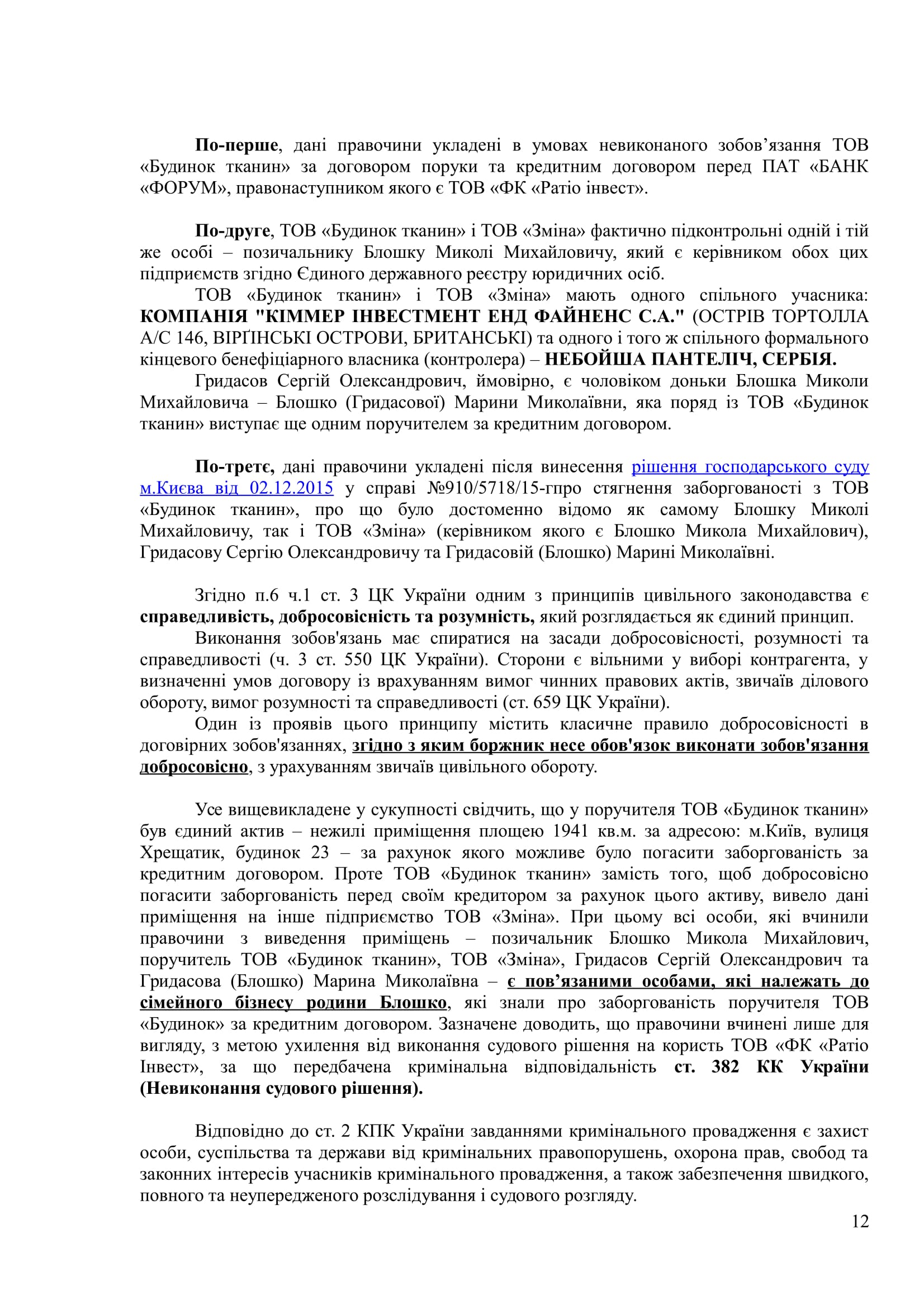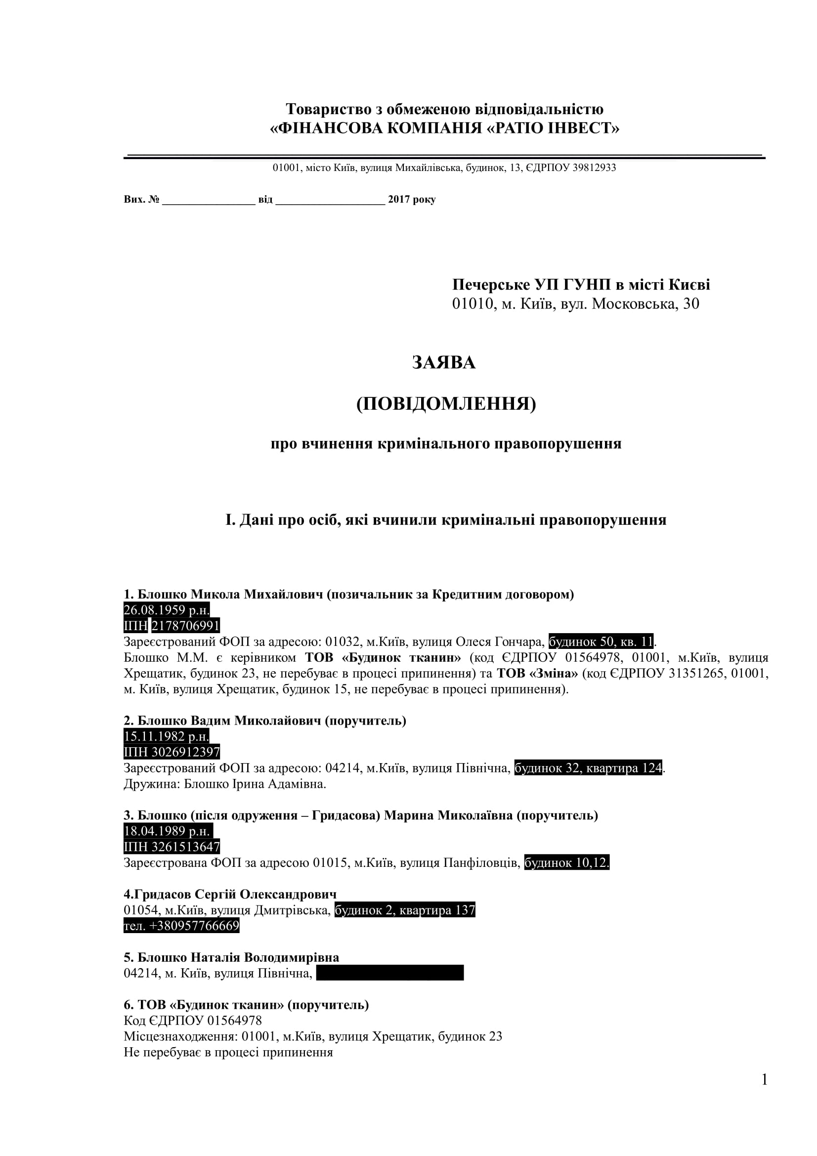 Но чтобы избежать исполнения этого решения суда, семья Блошко применила еще одну хитромудрую схему. Еще на этапе судебных дрязг, в марте 2016 года, помещения ООО «Будинок тканин» были переданы в уставной фонд ООО «Змина», которое также подконтрольно семье Блошко. После этого ООО «Змина» продало 2/3 здания Сергею Гридасову – зятю Николая Блошко, мужу Марины, а еще 1/3 – самому Николаю Михайловичу. А в августе 2016 года Сергей и Николай снова внесли помещения в уставной фонд ООО «Змина», но уже от своего имени. Очевидно, что цель этих фиктивных операций – сделать невозможным выполнение обязательств по кредитному договору, на данный момент перед ООО «ФК «Ратио Инвест», что подпадает по действие статей Уголовного кодекса об умышленном неисполнении судебных решений.