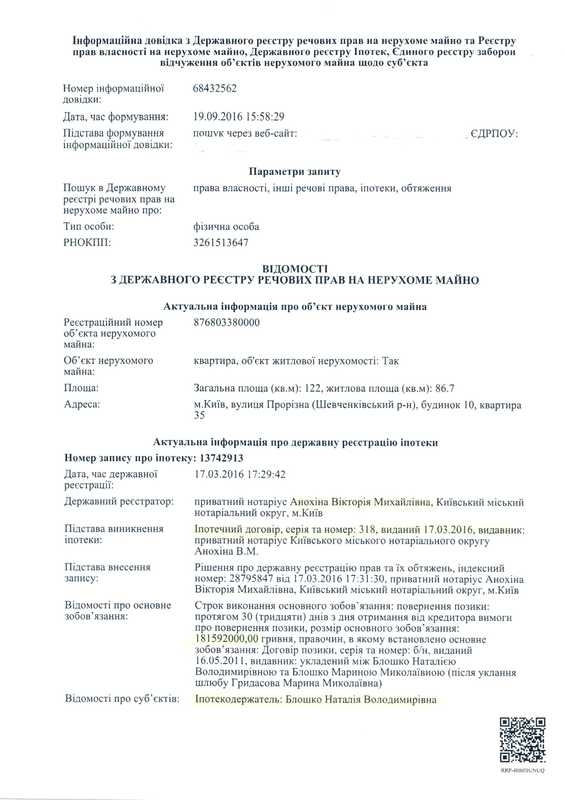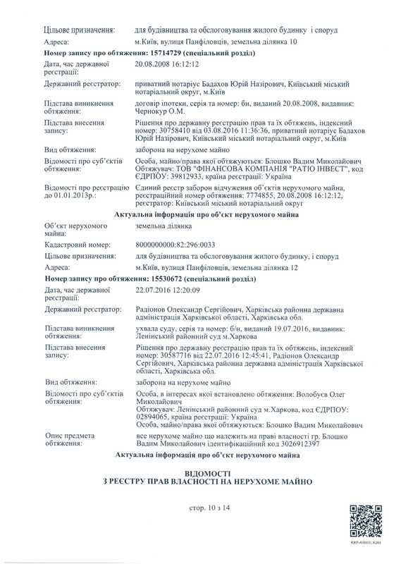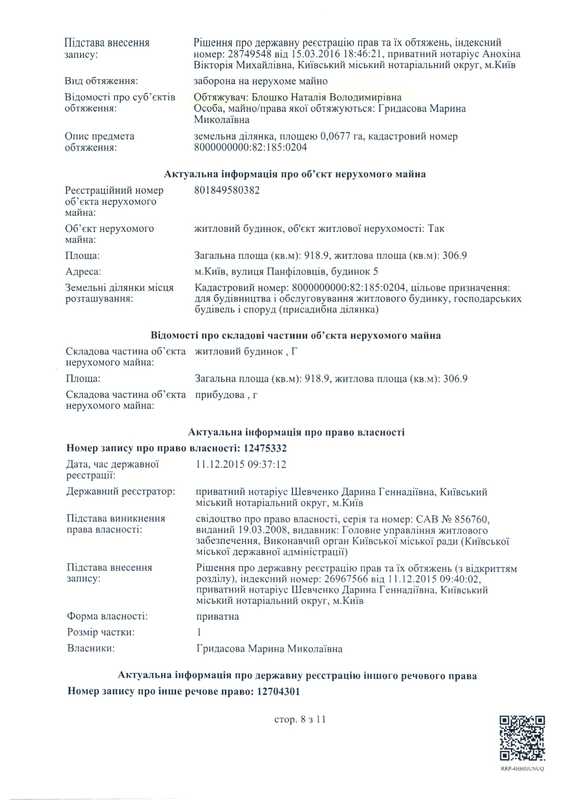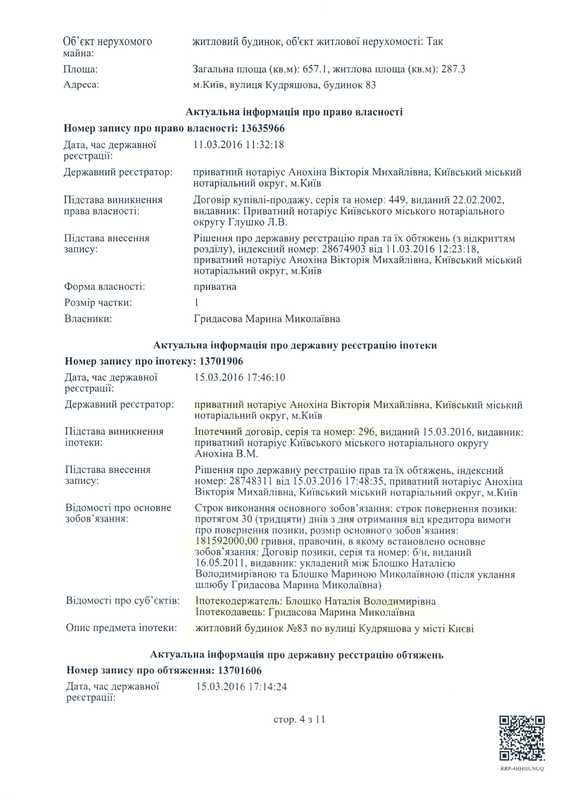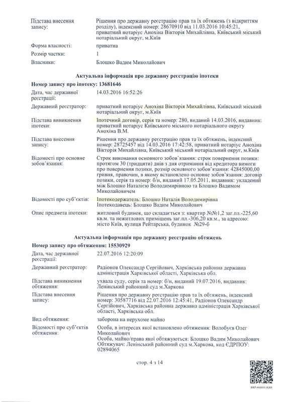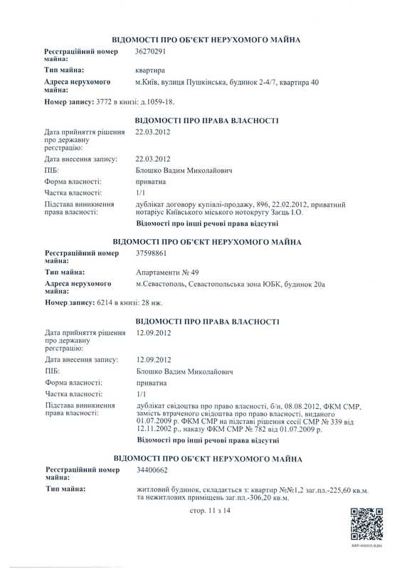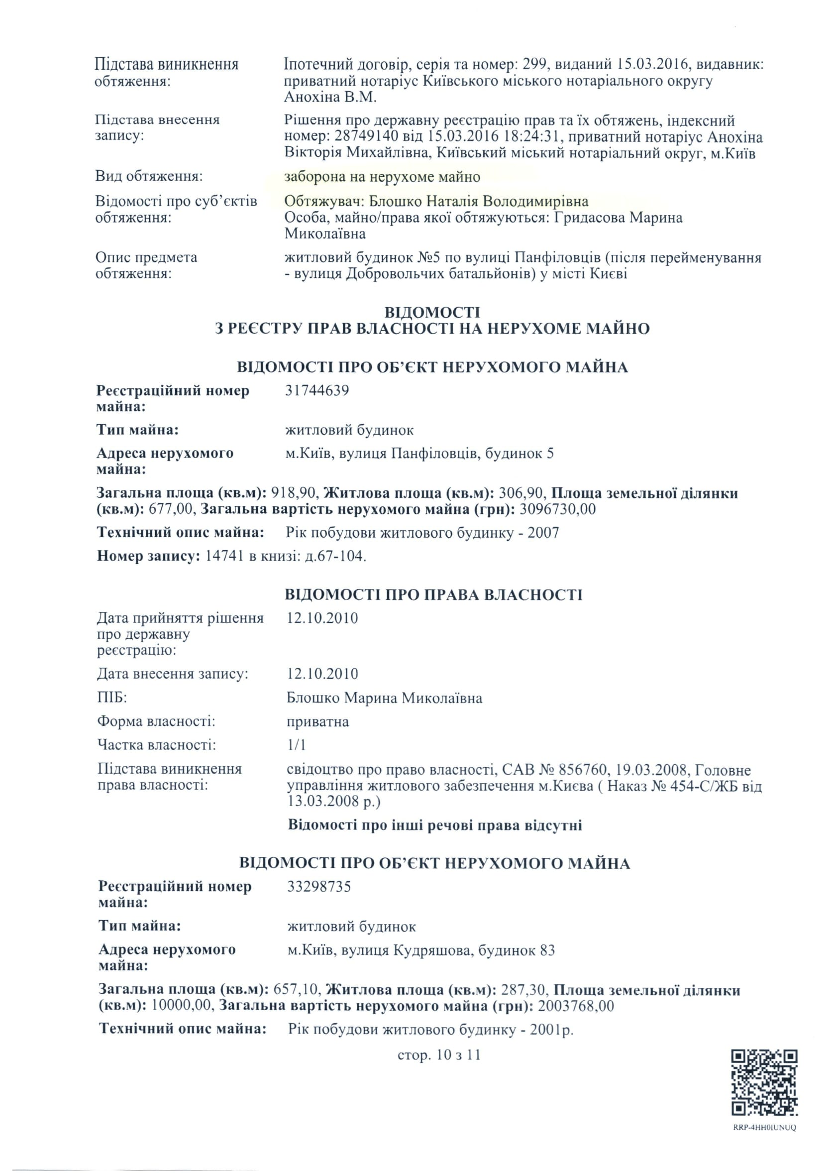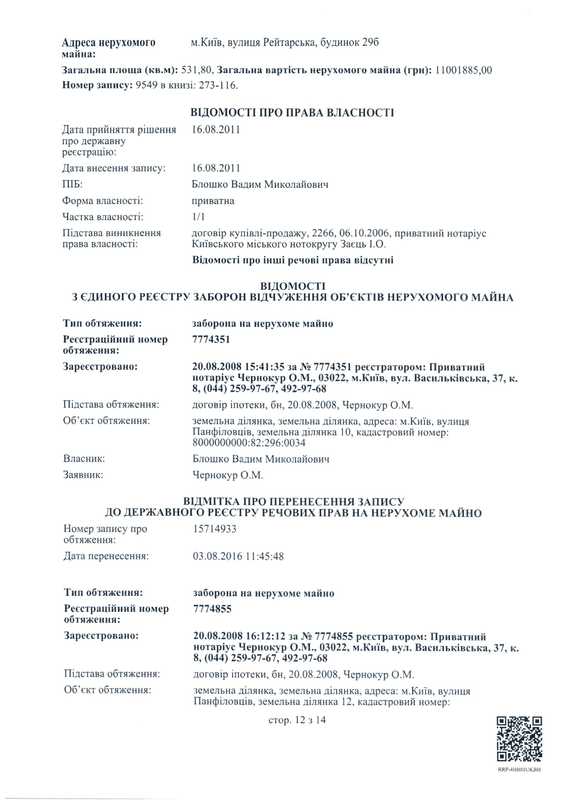 Что же пошло в этот фиктивный «залог»?! Жилой дом на 226 кв.м. и нежилых помещений 306 кв.м. по ул. Рейтарской в Киеве; квартира 40 кв. м по ул. Пушкинской в Киеве; квартира 122 кв.м на ул. Прорезной в Киеве; дом 657 кв. м. и земельный участок на ул. Кудряшова в Киеве; нежилые помещения на 197 кв. м на ул. Гринченко в Киеве; 7 соток земли и дом на 920 кв. м на ул. Панфиловцев (Добровольческих батальонов) в Киеве; 25 соток земли в г. Яремча Ивано-Франковской области.