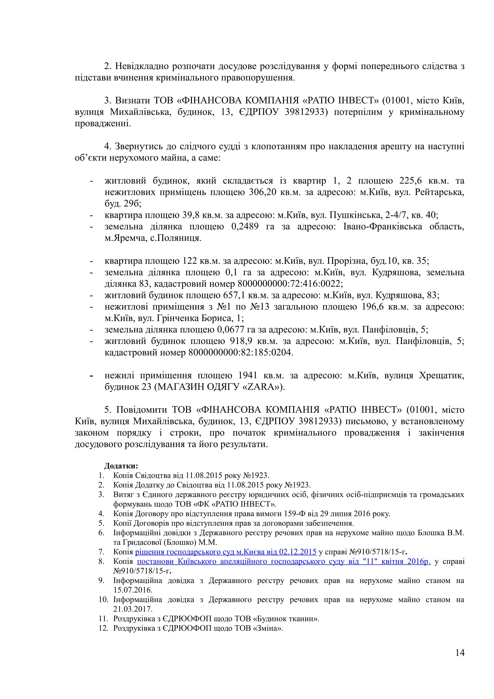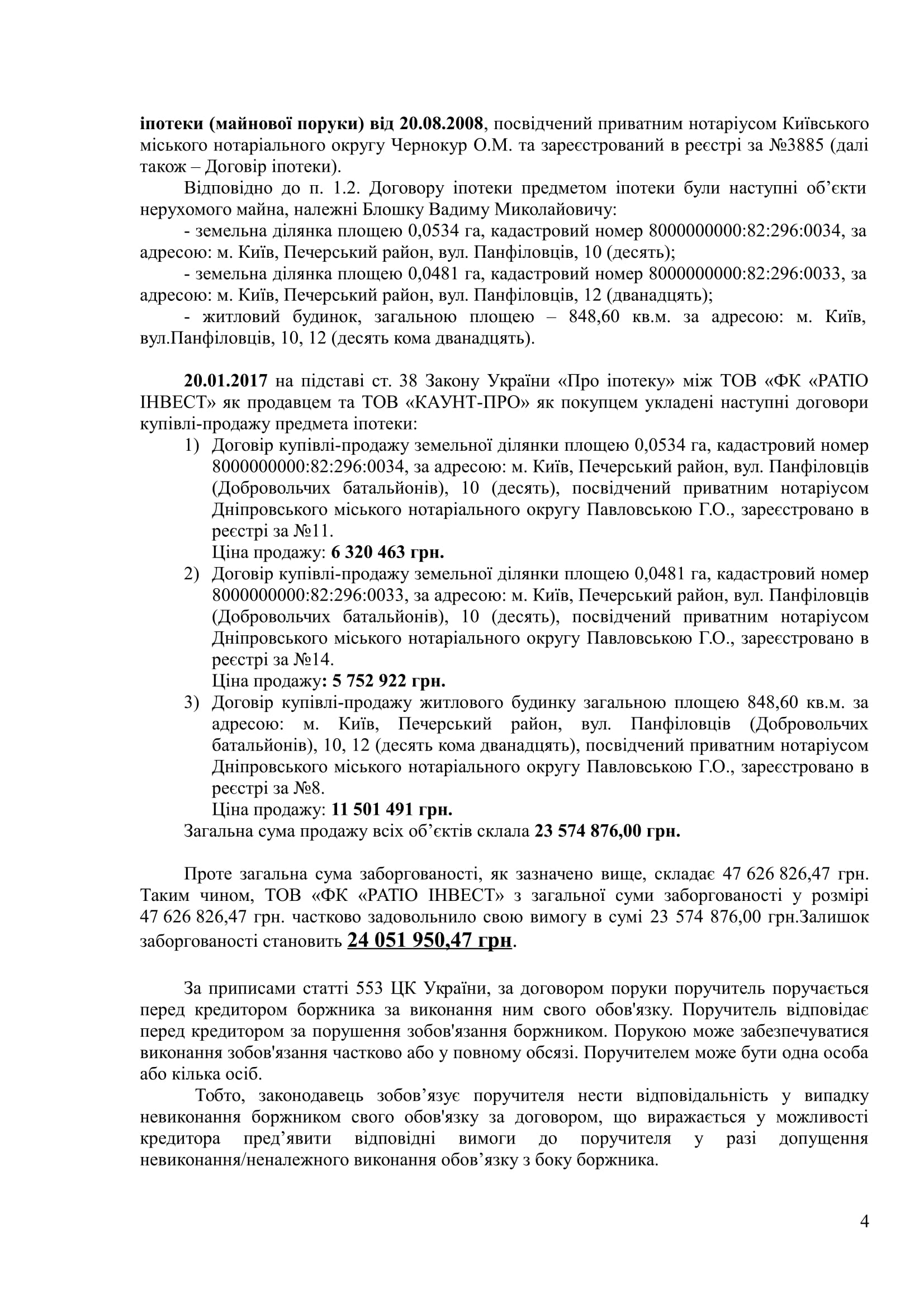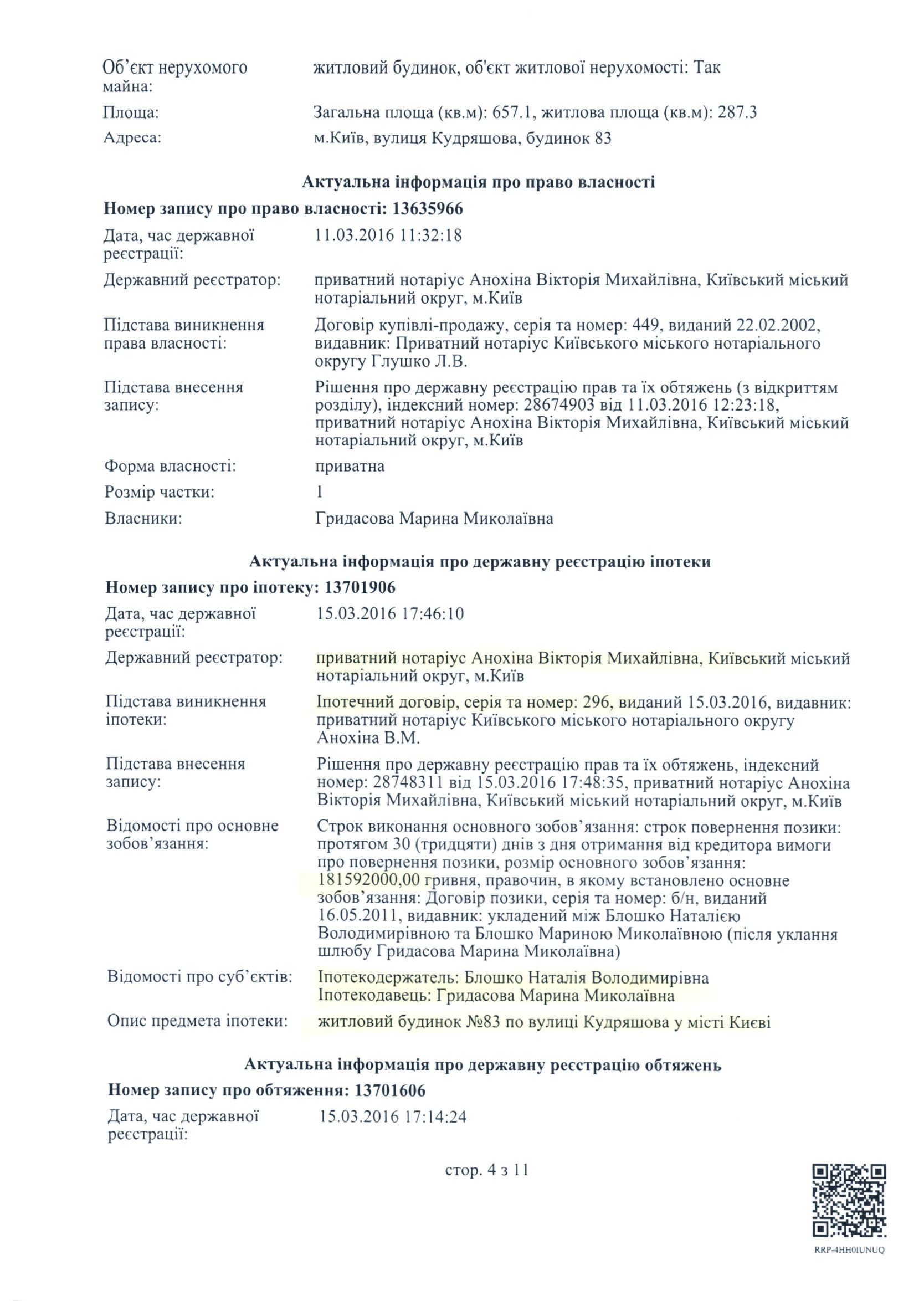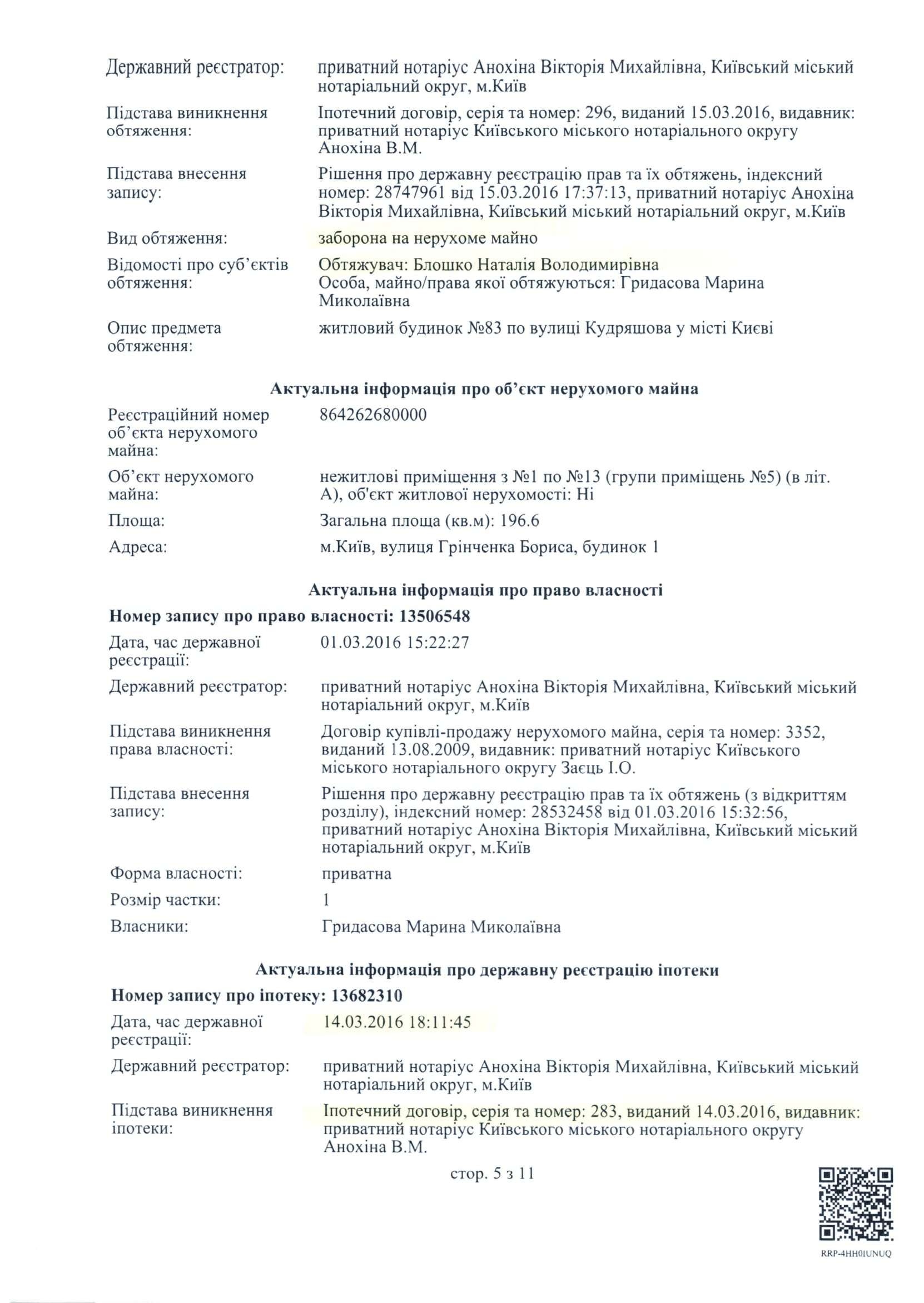 Что же пошло в этот фиктивный «залог»?! Жилой дом на 226 кв.м. и нежилых помещений 306 кв.м. по ул. Рейтарской в Киеве; квартира 40 кв. м по ул. Пушкинской в Киеве; квартира 122 кв.м на ул. Прорезной в Киеве; дом 657 кв. м. и земельный участок на ул. Кудряшова в Киеве; нежилые помещения на 197 кв. м на ул. Гринченко в Киеве; 7 соток земли и дом на 920 кв. м на ул. Панфиловцев (Добровольческих батальонов) в Киеве; 25 соток земли в г. Яремча Ивано-Франковской области.