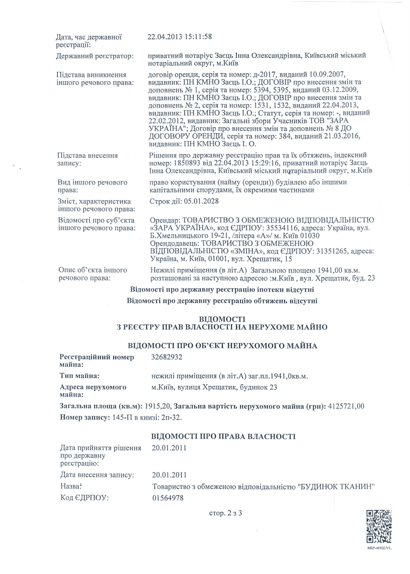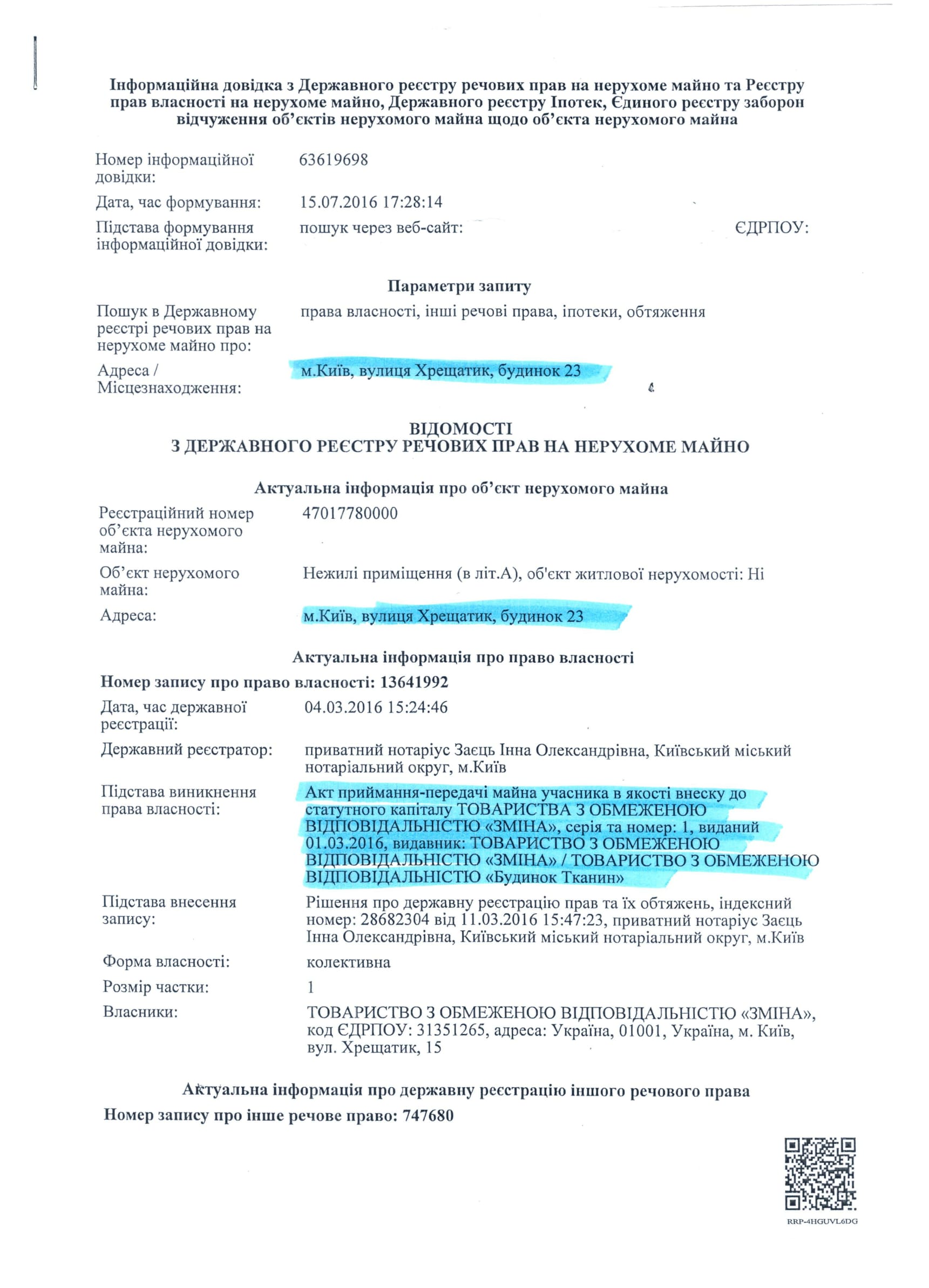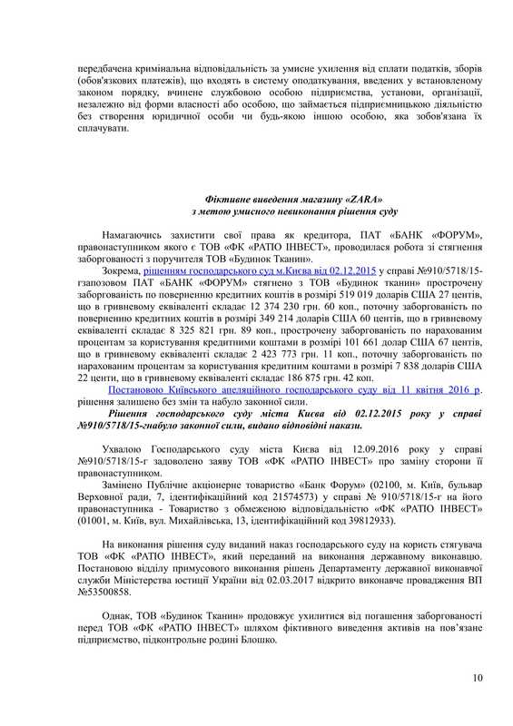 В одном из судебных процессов, которые банк «Форум», а затем и его правопреемник ООО «ФК «Ратио Инвест», инициировали против семейства Блошко, департаментом исполнительной службы Минюста было открыто производство о взыскании в пользу «Ратио» того самого здания на Хрещатике, 23 площадью 1941 кв. м, где раньше располагался Дом тканей, а сегодня находится Zara. Решение было принято судом еще в декабре 2015 года. Это был единственный актив третьего поручителя по кредиту Николая Блошко – ООО «Будинок тканин».
