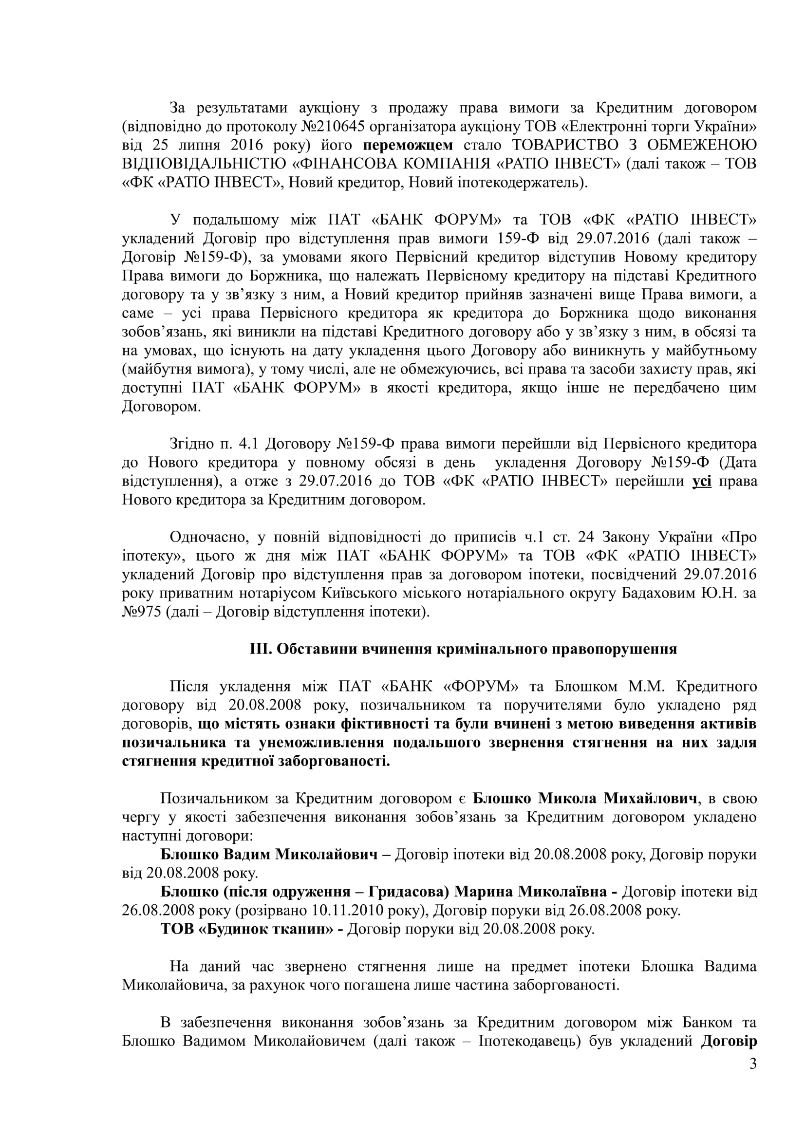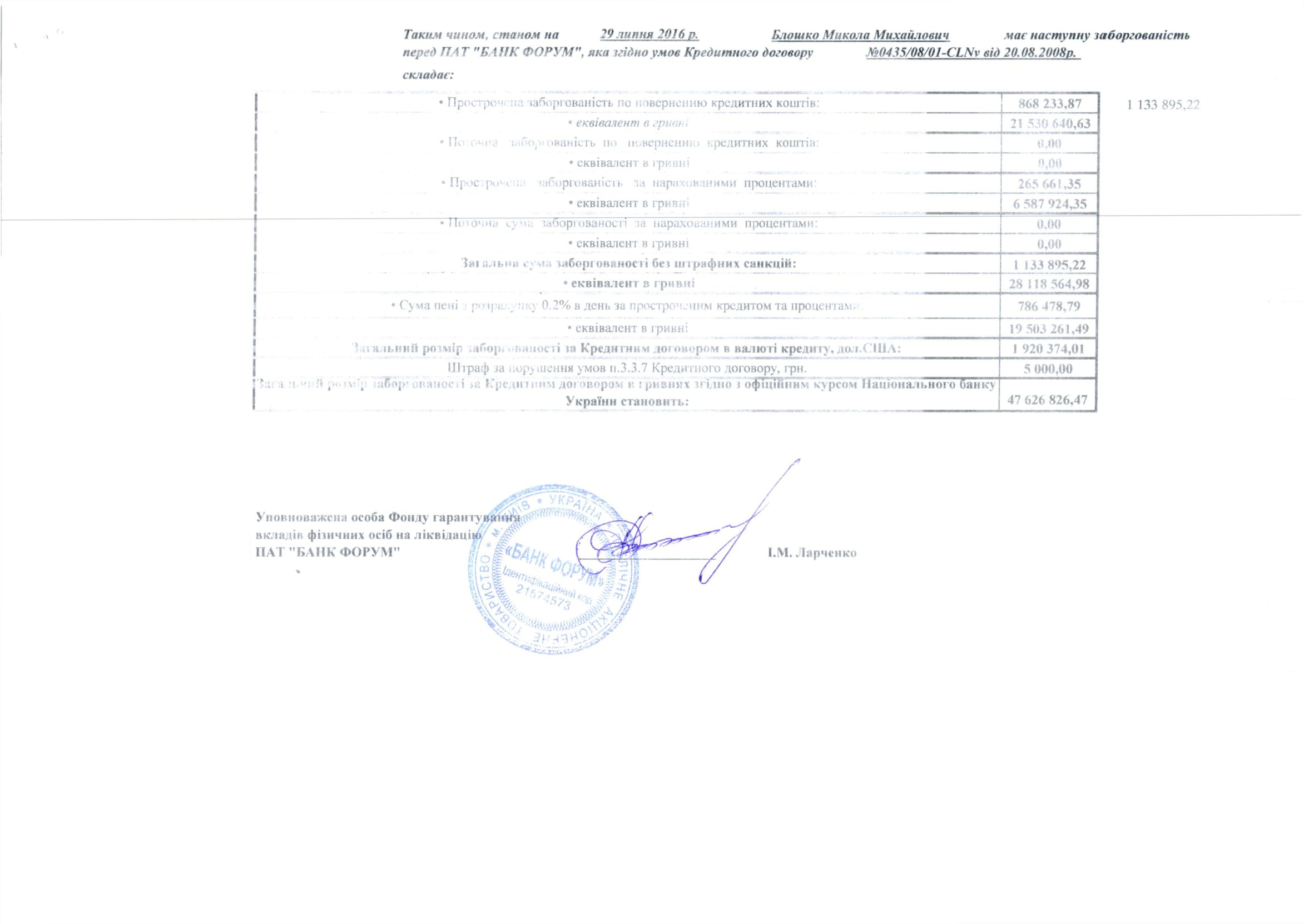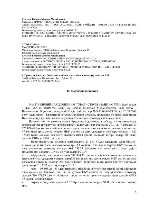 В июле 2016 года финансовая компания ООО «ФК «Ратио Инвест» выкупила у банка «Форум» права требования по кредиту на аукционе, тем самым получив все права кредитора, и могла требовать возврата долгов как от должника, так и от всех поручителей. Сумма долга на момент выкупа - $1,9 млн. или около 47,6 млн. грн. по курсу НБУ на момент аукциона.