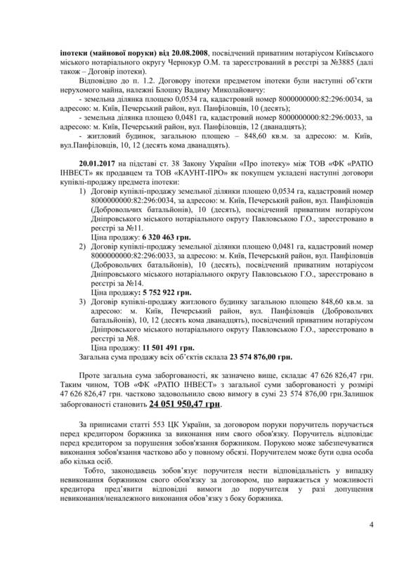 В судебном производстве слушалось больше 20 дел, связанных со взысканием долга, обращением взыскания на предмет ипотеки, признанием договоров ипотеки и поручительств недействительными. Искусственные споры, создаваемые должником со своими подельниками исключительно для ареста предмета ипотеки и блокирования обращения взыскания. Но все же финансовая компания ООО «ФК «Ратио Инвест» на абсолютно законных правах кредитора сумела обратить взыскание на два участка и здание, где размещается Посольство Греции, а в январе 2017 года продало их добросовестному приобретателю - компании ООО «Каунт-Про». Общая сумма вырученных средств составила 23,6 млн. грн.