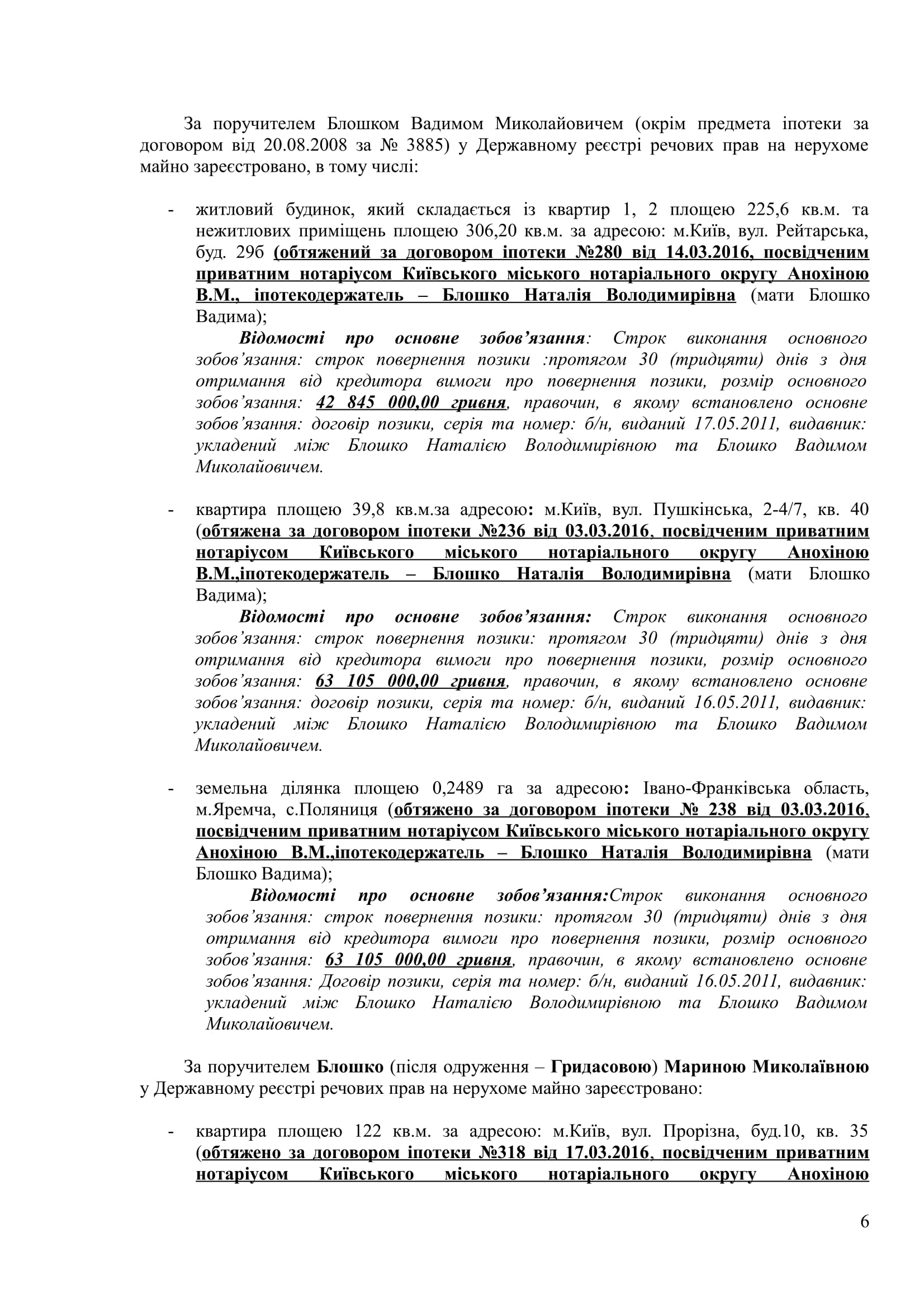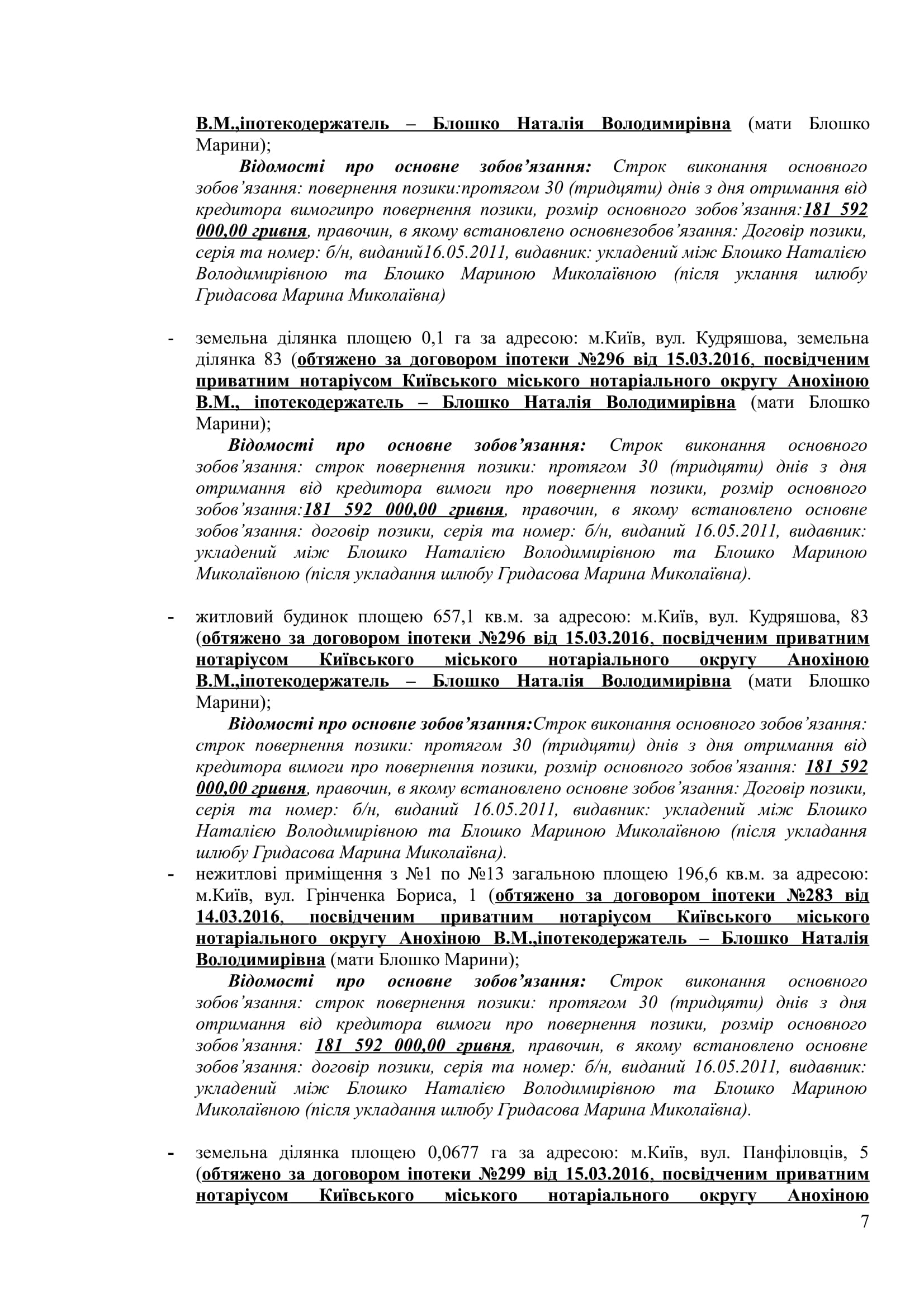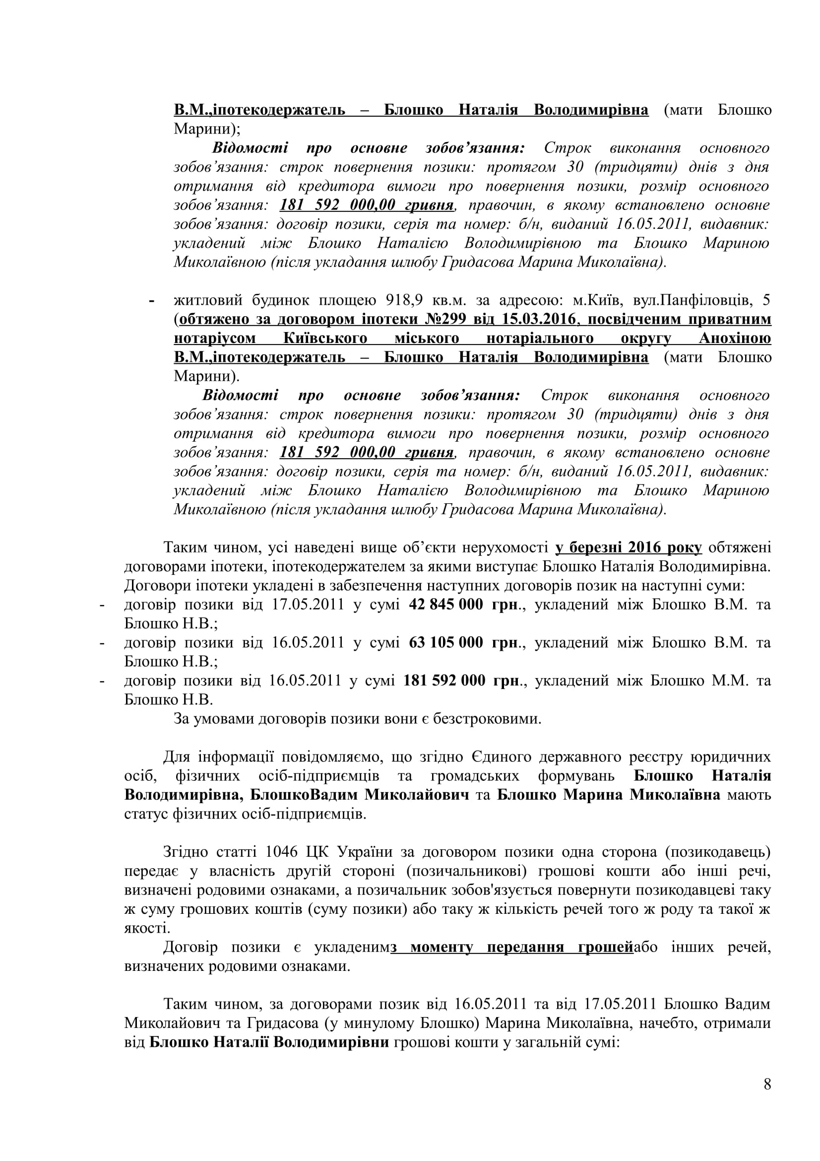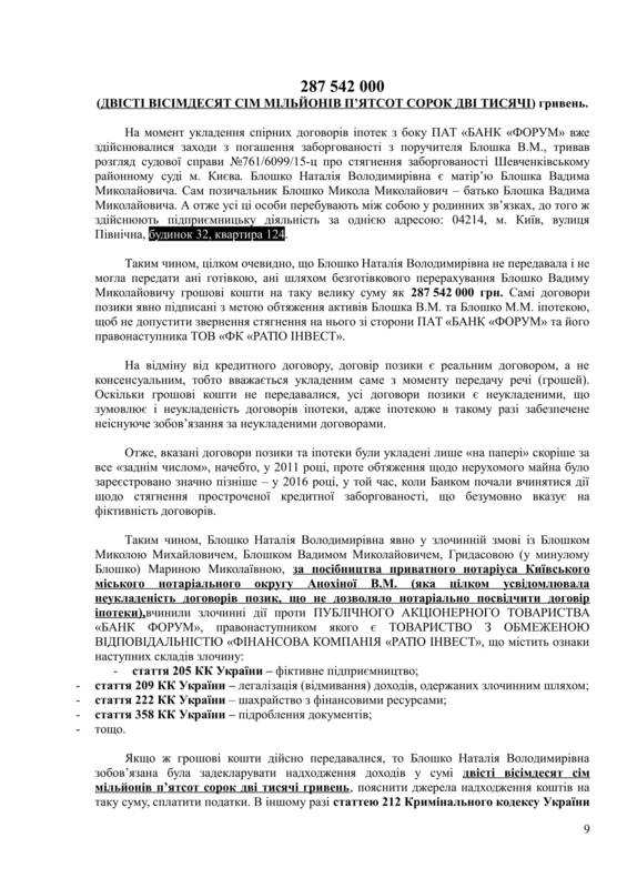 Оказалось, что якобы еще в 2011 году мать семейства, Наталья Блошко, якобы, выдала своим детям Вадиму и Марине Блошко займы на общую сумму более $35 млн. (287 млн грн. на тот момент) С 2011 года о существовании этих займов ничего не было известно, пока в марте 2016 года не были заключены договоры ипотеки. Получается, когда пришло время отцу рассчитываться по долгам перед банком, а после перед новым кредитором, он и его поручители-дети неожиданно оказались «голыми и босыми». То есть фактически мать взяла у детей в ипотеку имущества на 287,5 млн грн.
