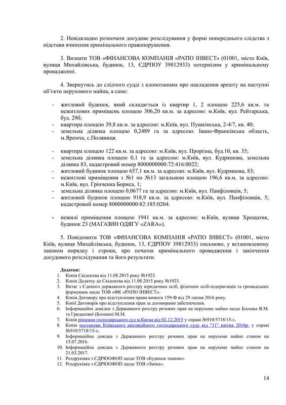 В «Ратио Инвест» уже обратились в полицию с требованием открыть уголовное производство по этому факту, а также требовать от следственного судьи наложить арест на все имущество семейства Блошко, включая магазин Zara. Поданы иски в суд о признании фиктивными договоров.