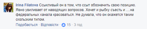 "Сс*кливый он в том, что сс*т обозначить свою позицию. Явно увиливает от наводящих вопросов. Хочет и рыбку съесть и ....на федеральных канала красоваться. Не думала, что он окажется таким скользким типом", - отметила Ирина Филатова.