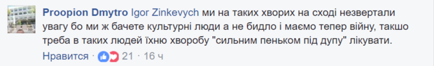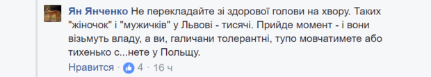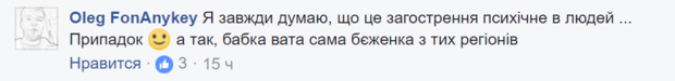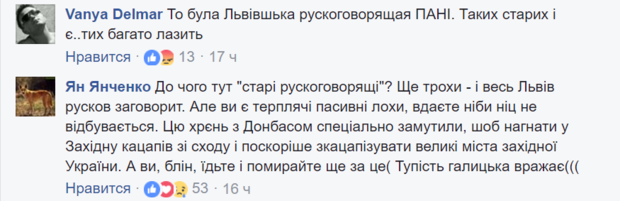 "И вот у меня вопрос. Какого черта, и что это было? Что эта сепарня делает здесь? Еще и разжигает дальше конфликт (у меня много знакомых нормальных патриотов из Донецка). А это какая-то совковая в*тная бабка, и что она забыла во Львове, вот вам и терпимость, она не боится это говорить на улице незнакомым людям...", - добавила она.