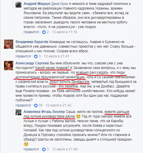 «Лучше Н.Я., чем тупой и воровитый Захар с его нукерами», — отреагировал на новость от Ходаковского экс-командир террористов Игорь Безлер. На это бывший руководитель спецподразделения СБУ «Альфа» (который перешел на сторону РФ с начала весны 2014) Ходаковский ответил, что за поддержку Азарова Безлеру может обломиться пост «министра обороны «ДНР». Ходаковский сравнил такой поворот со сдачей в плен Украине: «Если любая альтернатива лучше — поднимайте руки и сдавайтесь».