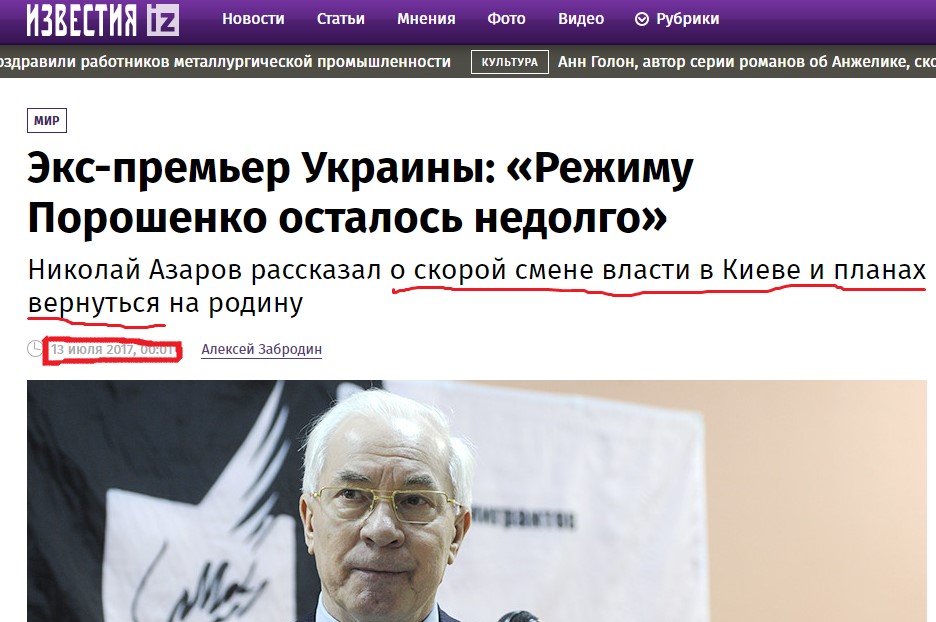 А уже 13 июля в 00.01, то есть через 3 часа после публикации в ФБ, сделанной Ходаковским – на сайте российских «Известий» появилось интервью самого Николая Азарова – о том, что ему не терпится вернуться, и у него уже есть план того, как это сделать.
