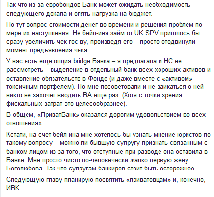 Кстати, на счет бейл-ина мне хотелось бы узнать мнение юристов по такому вопросу – можно ли бывшую супругу признать связанным с банком лицом из-за того, что отступные при разводе она оставила в Банке. Мне просто чисто по-человечески жалко первую жену Боголюбова. Так что супругам банкиров стоит быть осторожнее.