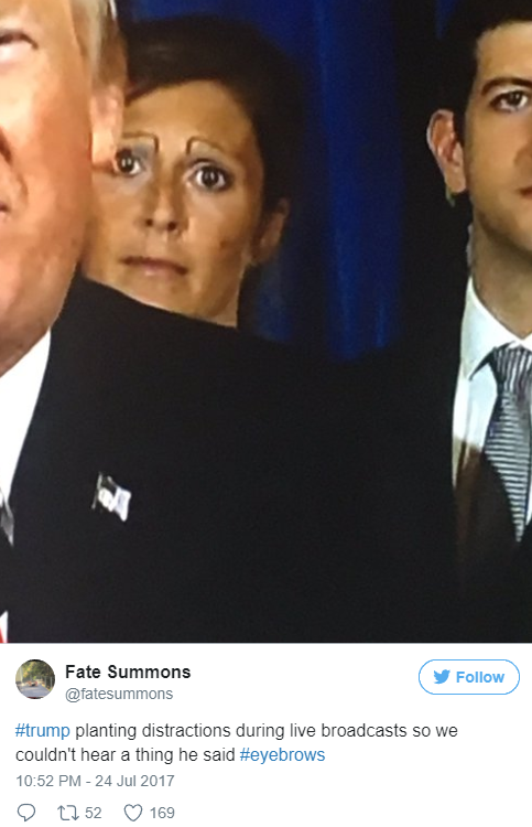 Некоторые блогеры решили, что женщина оказалась за спиной Трампа неслучайно, а один из пользователей пошутил, что такая форма бровей – естественная реакция на речи Трампа.