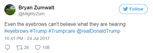 Президент США Дональд Трамп произнес речь, критикующую систему медстрахования Obamacare, однако все внимание зрителей было приковано лишь к женщине с удивительными бровями, которая стояла у американского лидера за спиной.
