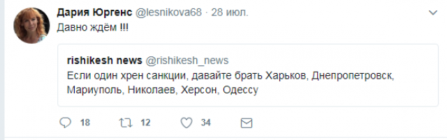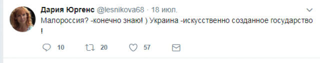 Пост, содержащий призывы к вторжению в украинские города, далеко не первый в этом роде. Ранее малоизвестная «деятельница российской культуры» сообщала, что признает «Малороссию», а Украину считает «искусственно созданным государством» и с гордостью величает себя «ватницей».