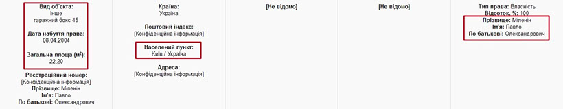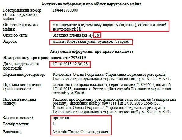 Павло Олександрович також задекларував квартиру на 121 кв. м і два гаражні бокси площею 40 кв.м у Києві. Однак через відсутність цього майна в державному реєстрі речових прав нам не вдалося ідентифікувати його розташування.