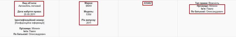 Серед автомобілів, якими володіє Павло Олександрович, є BMW 530d 2011-го року випуску. У 2011-му воно коштувало 835 тис. грн, однак на початку 2017 року Павло Міленін, схоже, продав це авто за 918 тис. грн.