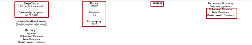 Не менш дорогий автомобіль у дружини прокурора. У 2016 році Катерина Міленіна придбала новеньке BMW X5 2016-го року випуску за 1,6 млн грн.