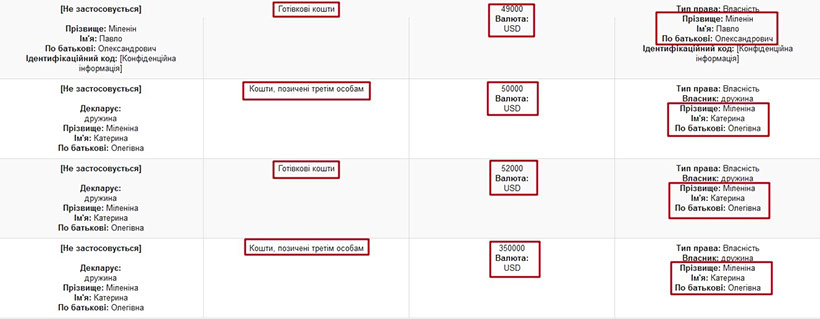 Попри витрати на подорожі та купівлю рухомого й нерухомого майна, прокурорська родина змогла заощадити досить багато готівки. У Павла Міленіна задекларовано 49 тис. дол. Іще 52 тис. дол. готівки має його дружина. Окрім цього, Катерина Міленіна позичила «третім особам» іще 400 тис. дол.!
